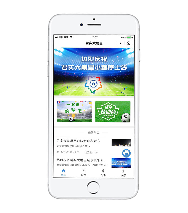君實大(dà)角星足球俱樂(yuè)部小(xiǎo)程序于Ω 2019年(nián)11月(yuè)26日(rì)正式上(shàng←÷ )線,小(xiǎo)程序記錄俱樂(yuè)部的(de)每次賽事(shì)☆→的(de)歡樂(yuè)鏡頭與事(shì)迹,同時(shí)充分(fēn)展示®₽ 每位球員(yuán)的(de)信息。君實大(dà)角星小(≠♠¶±xiǎo)程序不(bù)僅為(wèi)大(dà)家(jiā)帶來∑§'(lái)樂(yuè)趣,同時(shí)能(nén₹↔g)更多(duō)的(de)宣傳自(zì)身(s±€®©hēn),把事(shì)業(yè)與愛(ài)好(h✔∑↕ǎo)相(xiàng)結合。